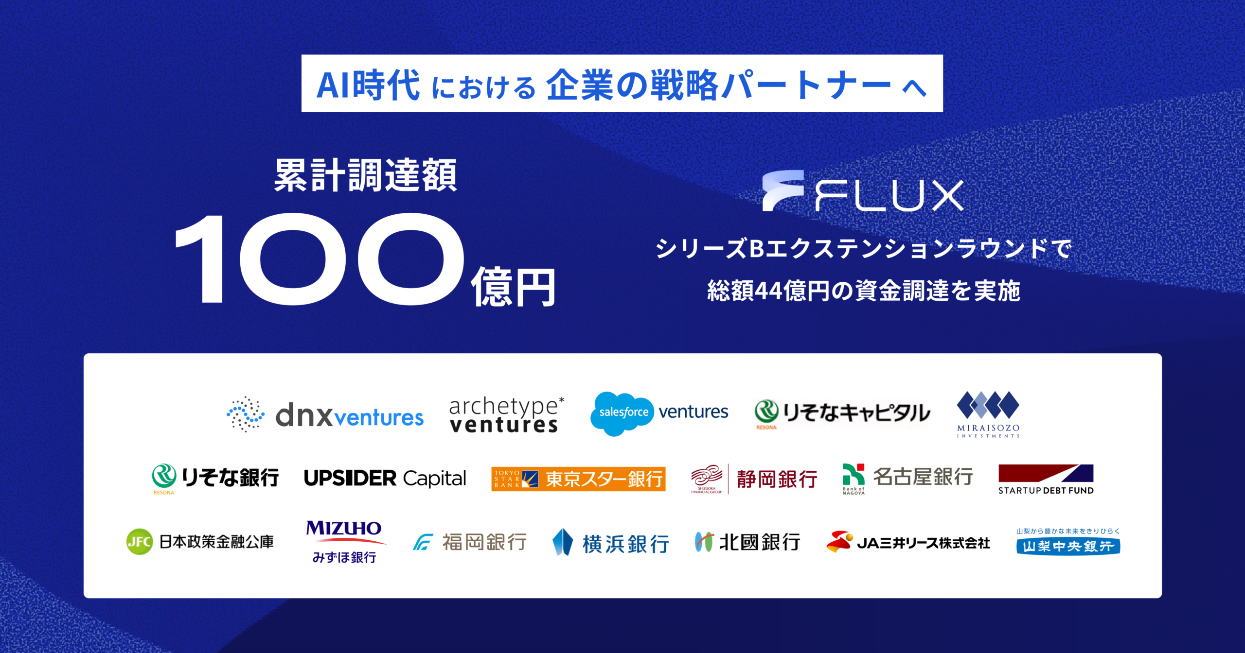 株式会社FLUX(読み:フラックス、本社:東京都渋谷区、代表取締役:永井元治、以下「FLUX」)はDNX Ventures、Archetype Ventures、Salesforce Ventures、りそなキャピタル、みらい創造インベストメンツらを引受先とする第三者割当増資および融資等を合わせて、総額44億円の資金調達をシリーズBエクステンションラウンドにて実施したことをお知らせいたします。今回の調達によりシリーズB全体の調達金額は88億円、累積資金調達額は100億円に到達します。