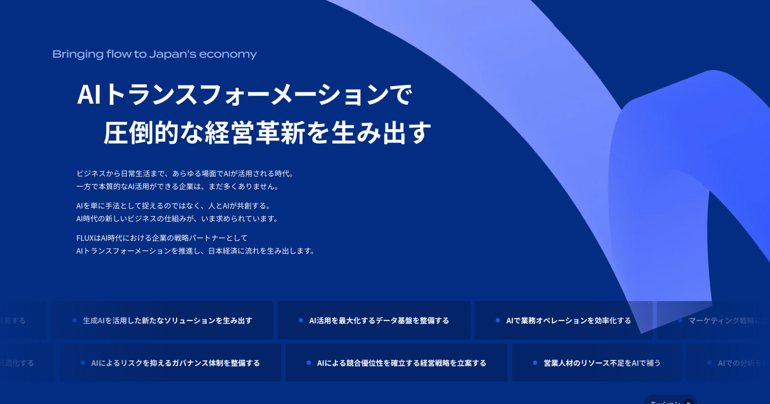 株式会社FLUXは「日本経済に流れを」をミッションに掲げ、AI時代における企業の戦略パートナーとして、AIトランスフォーメーションを推進するスタートアップです。